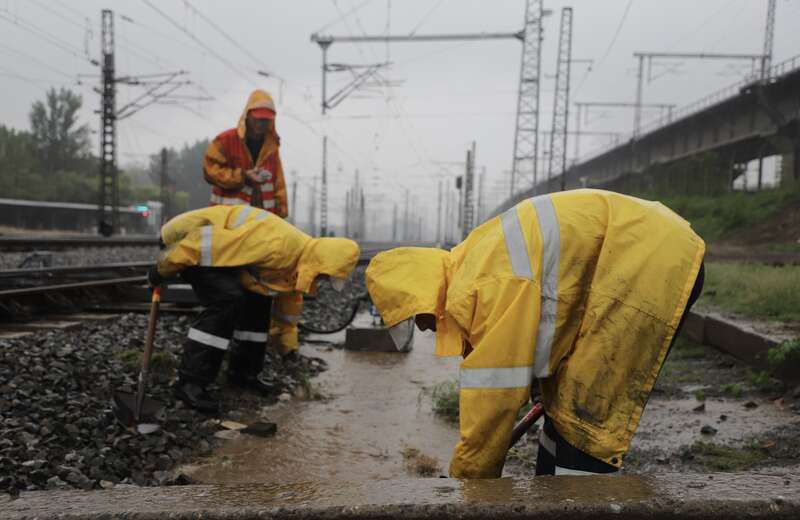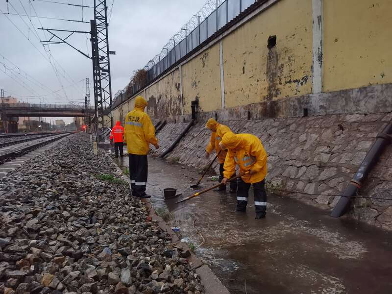 为保障汛期工作安全有序,济南西工务段组织各车间700余名干部职工,对防洪关键处所及时安排雨中巡检,重点检查挡墙护坡、高路堑、排水设施、隧道进出口等处所,对排水沟渠进行疏通,保证排水通畅,确保高铁运行安全。苏翼展/摄。