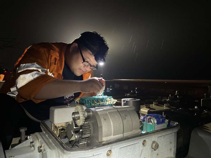 7月5日夜间,为保证线路设备正常运行,济南电务段济南东客专信号车间干部职工雨中检修道岔设备,逐个擦拭检查转撤机接点,发现设备隐患及时处置,筑牢汛期安全屏障。罗旭/摄。