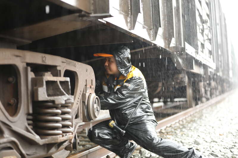 7月6日,陕西多地出现持续降雨天气,安康车辆段成立青年突击队,对货物列车进行技术检查,确保汛期货车运输安全正点。尹天娇/摄。