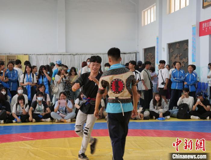 7月8日,内蒙古四子王旗,当地学生(正中蓝色衣服)正在指导台湾学生搏克运动的技巧。当日下午,“两岸青年交流研学营·内蒙古北疆文化研学之旅”的66名台湾高中师生走进内蒙古自治区乌兰察布市四子王旗蒙古族中学,与该校师生一起,沉浸式体验搏克、射箭、毡艺、蒙古族象棋、民族舞蹈等传统文化项目。孙凯文摄