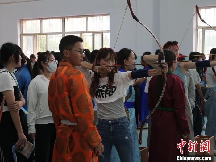 7月8日,内蒙古四子王旗,当地学生指导台湾学生射箭技艺。当日下午,“两岸青年交流研学营·内蒙古北疆文化研学之旅”的66名台湾高中师生走进内蒙古自治区乌兰察布市四子王旗蒙古族中学,与该校师生一起,沉浸式体验搏克、射箭、毡艺、蒙古族象棋、民族舞蹈等传统文化项目。孙凯文摄