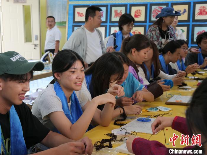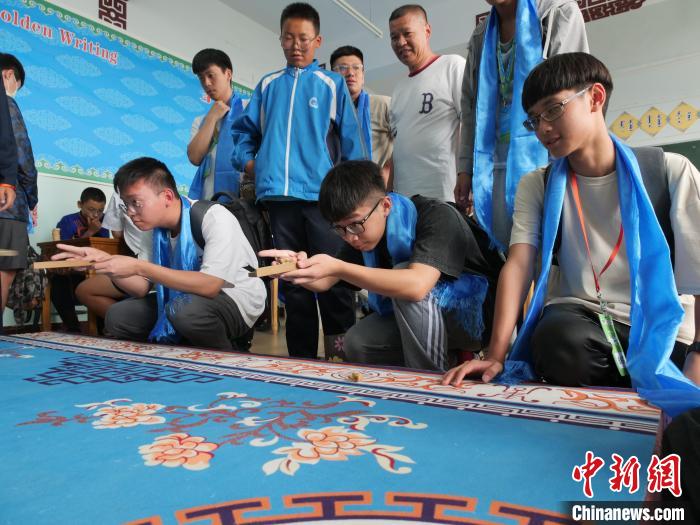 7月8日,内蒙古四子王旗,台湾高中生们正在动手缝制毡艺工艺品。当日下午,“两岸青年交流研学营·内蒙古北疆文化研学之旅”的66名台湾高中师生走进内蒙古自治区乌兰察布市四子王旗蒙古族中学,与该校师生一起,沉浸式体验搏克、射箭、毡艺、蒙古族象棋、民族舞蹈等传统文化项目。孙凯文摄