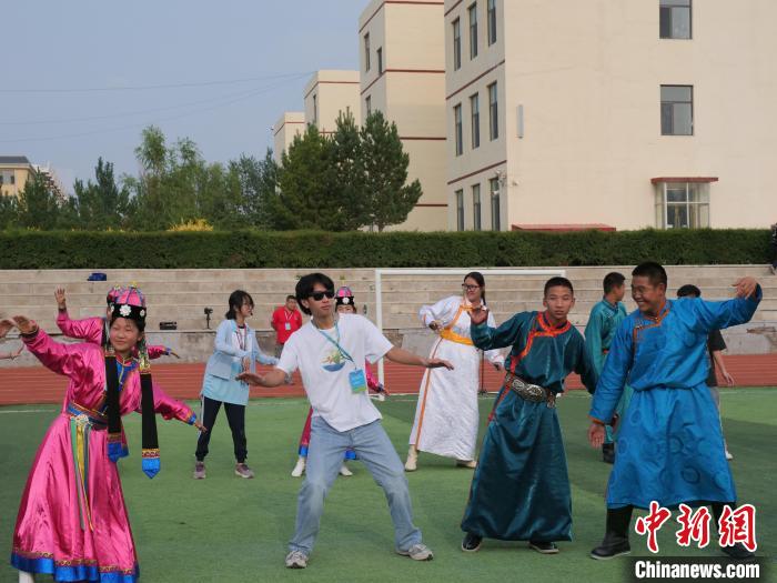 7月8日,内蒙古四子王旗,台湾学生在当地学生的带领下,兴奋地跳舞。当日下午,“两岸青年交流研学营·内蒙古北疆文化研学之旅”的66名台湾高中师生走进内蒙古自治区乌兰察布市四子王旗蒙古族中学,与该校师生一起,沉浸式体验搏克、射箭、毡艺、蒙古族象棋、民族舞蹈等传统文化项目。孙凯文摄