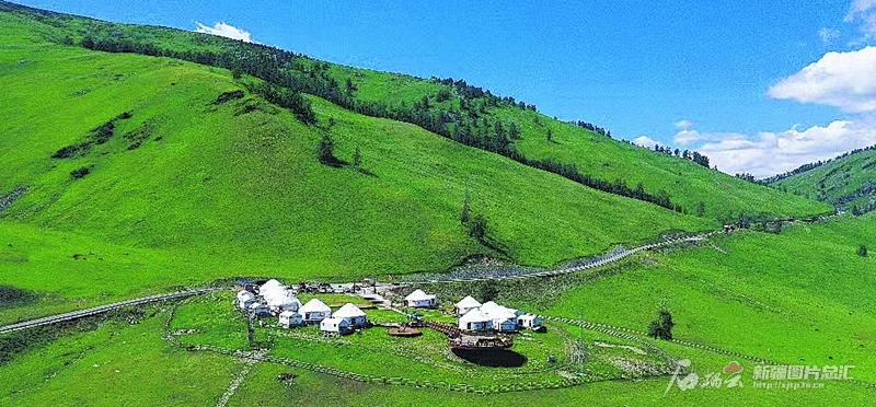 布尔津县铁尔沙汗生态牧场洁白的毡房点缀在草原上(6月21日摄)。游客可以在这里体验游牧民族的传统生活。加尔恒·阿热帕摄