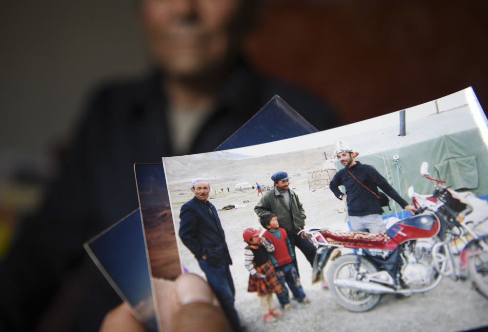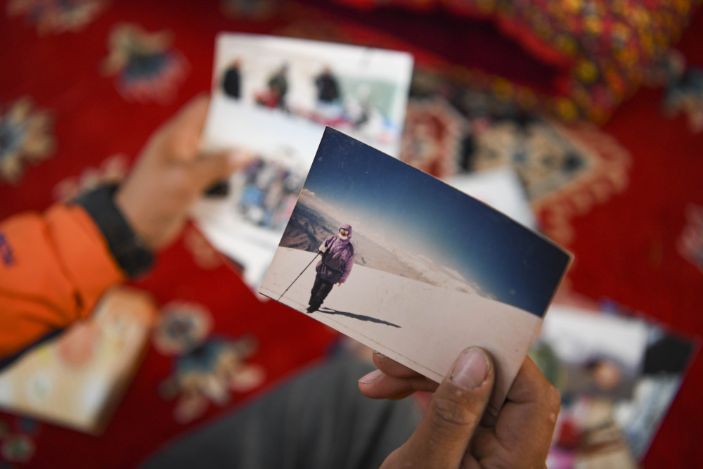 塔西巴伊拿着国外登山队于2004年8月6日拍摄的父亲在慕士塔格峰登山的照片端详(7月5日摄)。新华社记者 胡虎虎 摄