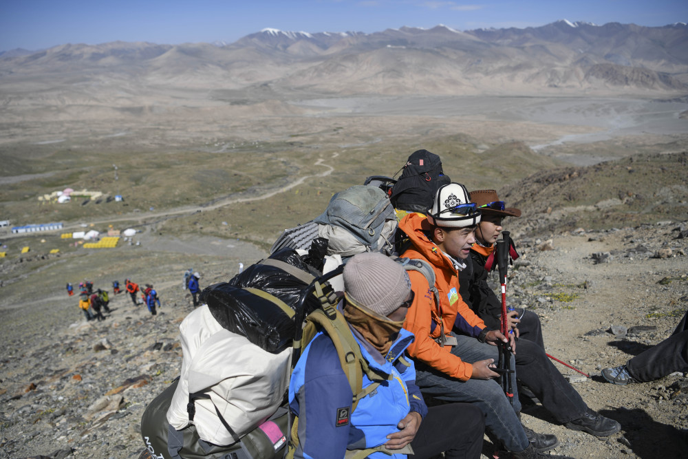 7月4日,上山途中,塔西巴伊(中)和同伴在海拔约4400米的休息点小憩,身后的登山队伍正缓缓而上。新华社记者 胡虎虎 摄