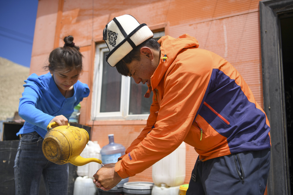 7月5日,塔西巴伊下山后回到家,妹妹为其倒水洗手。新华社记者 胡虎虎 摄