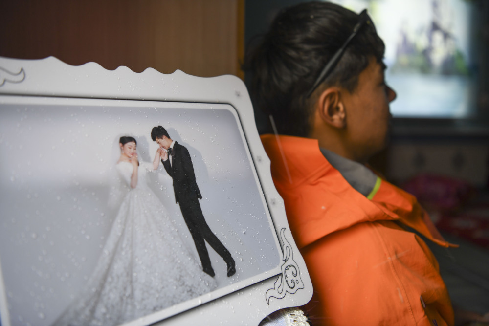 7月5日,塔西巴伊下山后回到家,靠在柜子上休息,冰雹来袭,雨水淋在他的结婚照上。新华社记者 胡虎虎 摄