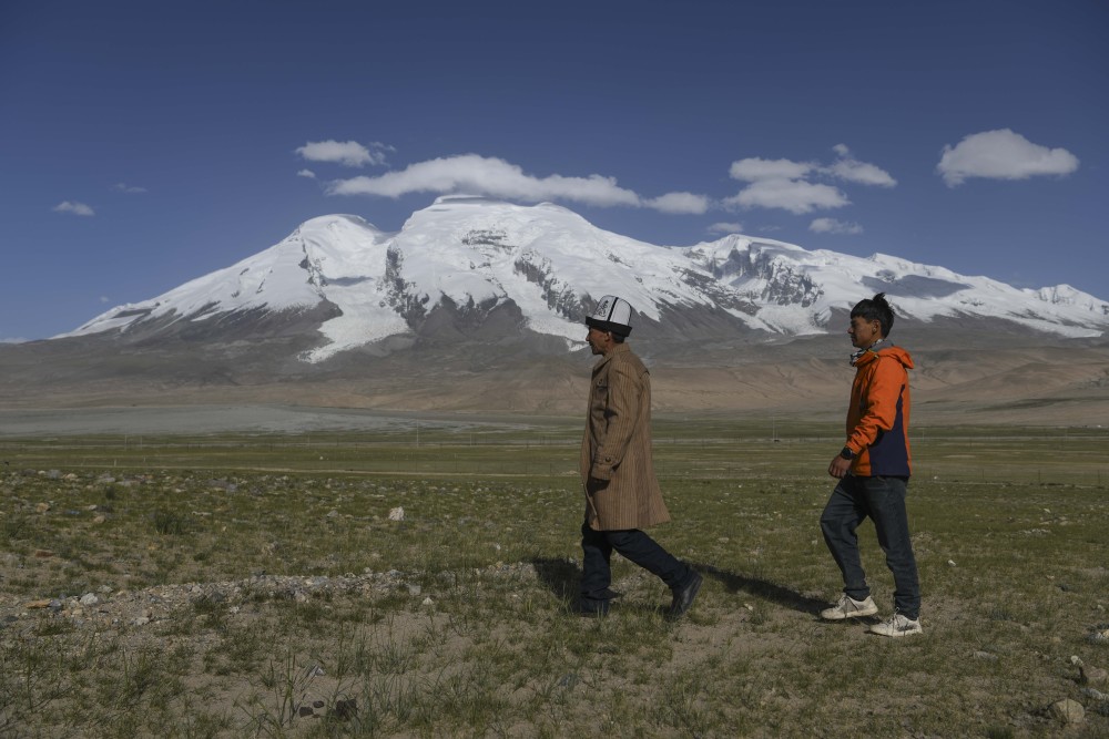 7月6日,塔西巴伊(右)和父亲加尼拜克路过慕士塔格峰脚下的牧场。新华社记者 胡虎虎 摄