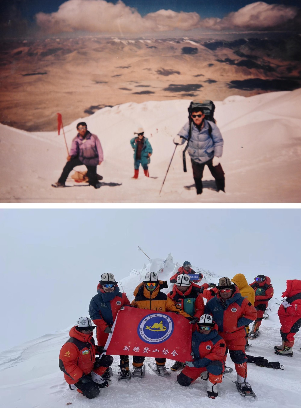 拼版照片:上图为父亲加尼拜克(左)与其兄弟于2004年8月6日一起为国外登山队服务时在慕士塔格峰上的合影(2024年7月5日翻拍资料照片,新华社记者胡虎虎摄);下图为儿子塔西巴伊(左三、黄衣者)和同伴于2023年7月29日登顶慕士塔格峰时的合影(受访者供图)。新华社发