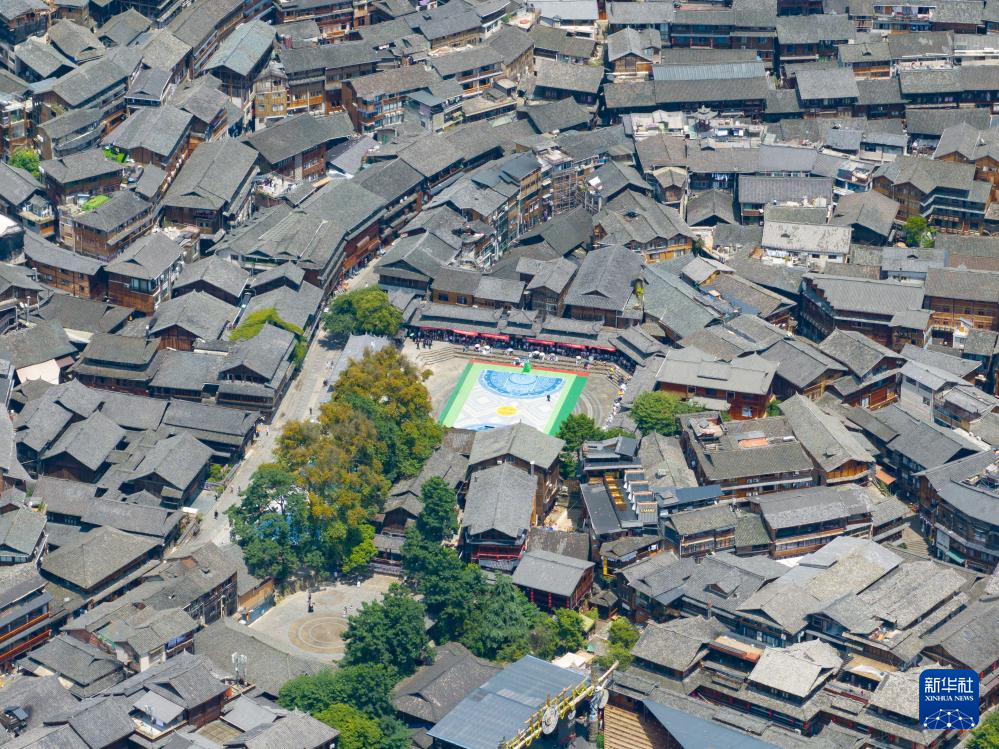 这是7月9日拍摄的西江千户苗寨内的一处篮球场(无人机照片)。