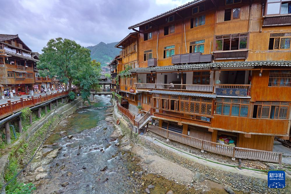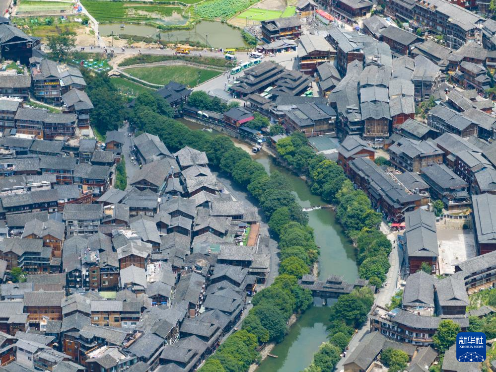 这是7月9日拍摄的西江千户苗寨内的河流与风雨桥(无人机照片)。