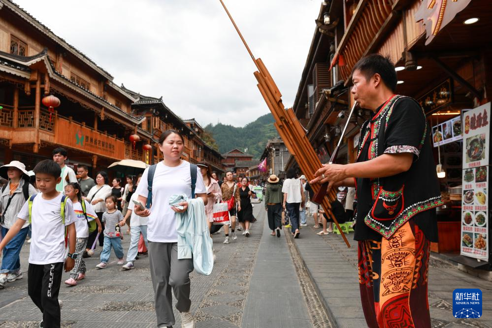 7月9日,演员在西江千户苗寨吹奏芦笙吸引游客。