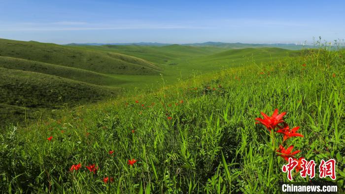 近日,内蒙古扎鲁特草原,火红的萨日朗花怒放。仲夏时节,内蒙古通辽市扎鲁特旗草原郁郁葱葱,鲜花盛开。极目远眺,黄的、蓝的、紫的野花装点着绿色的原野,牛羊如珍珠撒满山坡,勾勒出一幅绝美的草原牧歌图,令人心旷神怡。青格乐摄