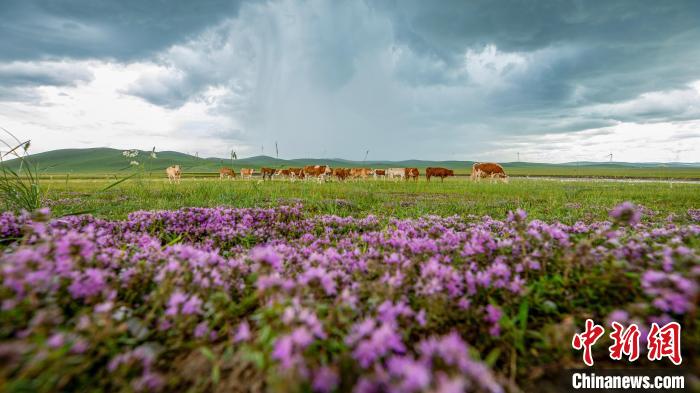 近日,内蒙古扎鲁特草原,水草丰美的牧场,花儿尽情的怒放。仲夏时节,内蒙古通辽市扎鲁特旗草原郁郁葱葱,鲜花盛开。极目远眺,黄的、蓝的、紫的野花装点着绿色的原野,牛羊如珍珠撒满山坡,勾勒出一幅绝美的草原牧歌图,令人心旷神怡。白敖敏摄