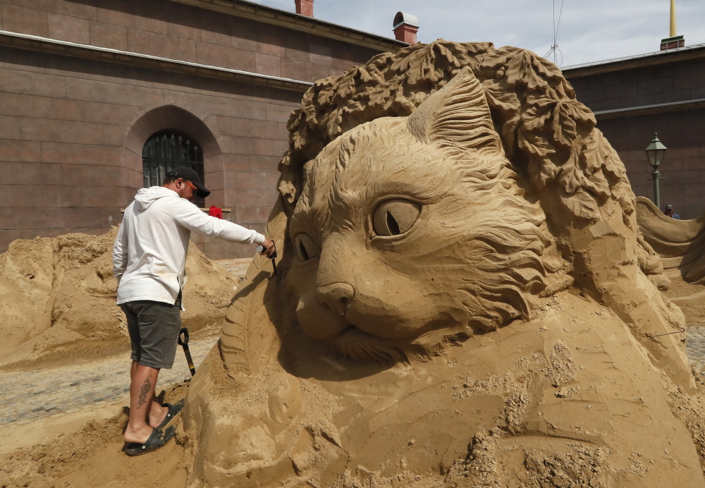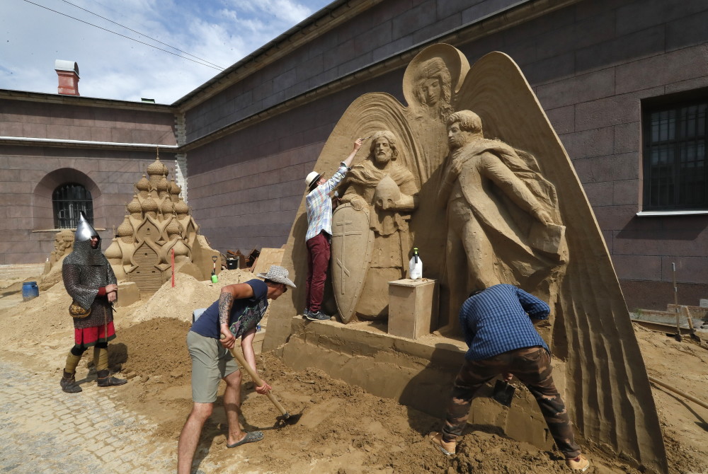7月11日,艺术家在俄罗斯圣彼得堡的彼得保罗要塞制作沙雕。新华社/欧新