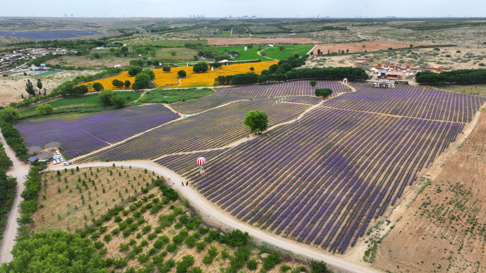盛夏时节,地处毛乌素沙地边缘的宁夏薰衣草庄园内花卉竞相开放,迎来盛花期。