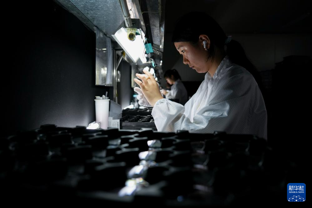 7月16日,在江苏丹阳一家光学眼镜有限公司,工作人员在镀膜车间内检查、填装镜片。