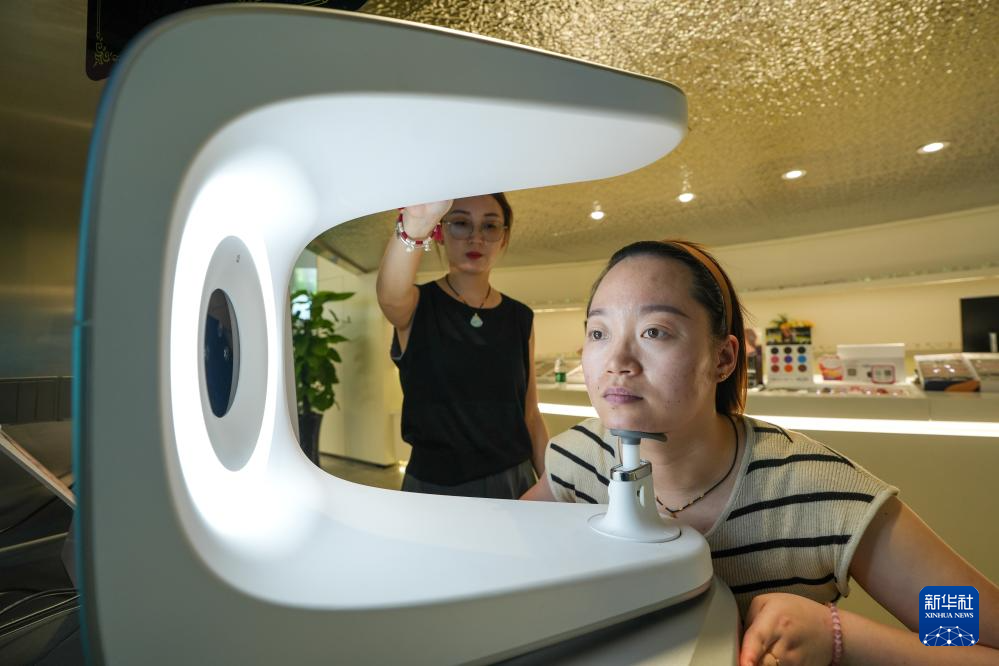 在江苏丹阳一家光学科技股份有限公司,消费者在体验3D面部扫描,制作专属镜框(7月15日摄)。