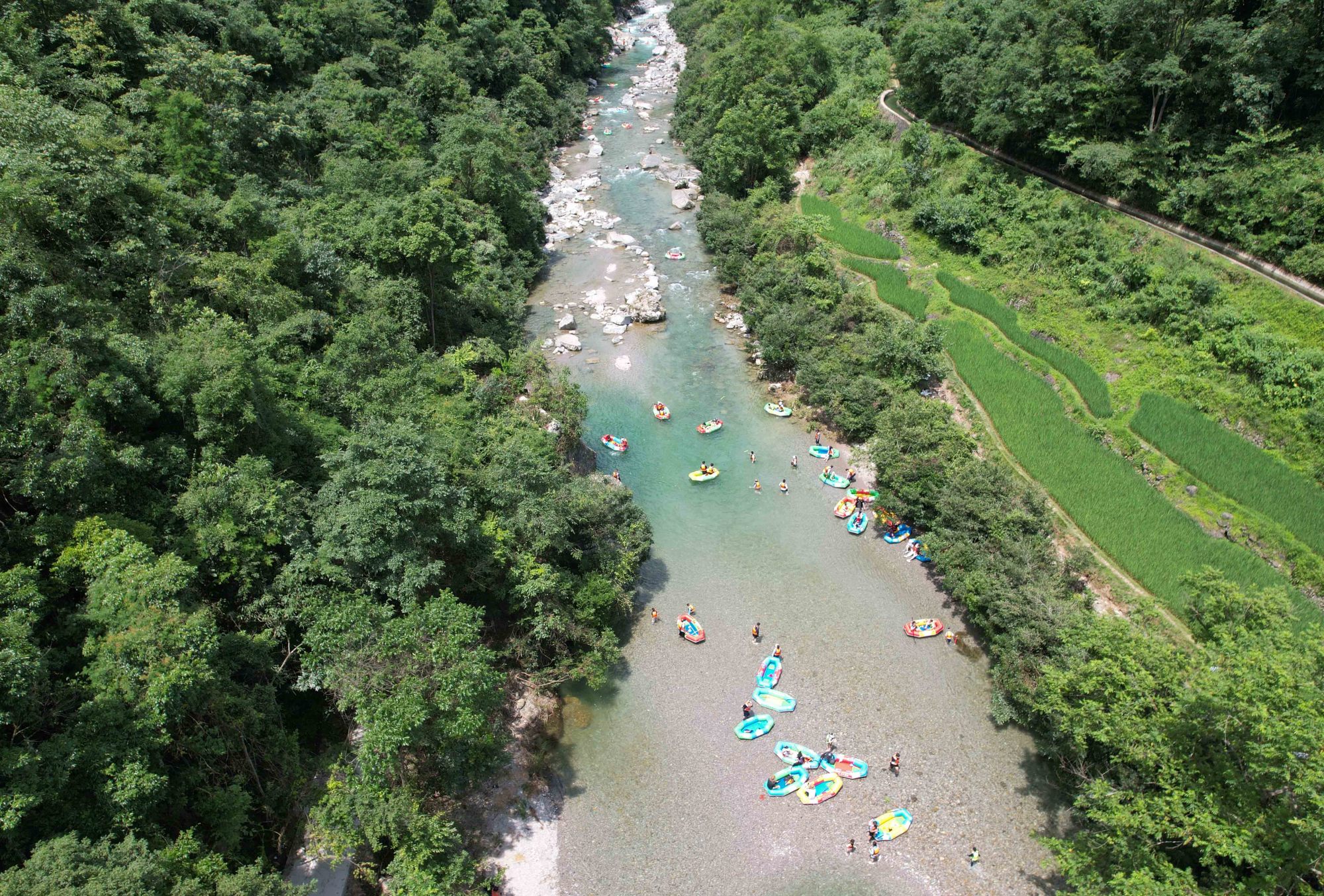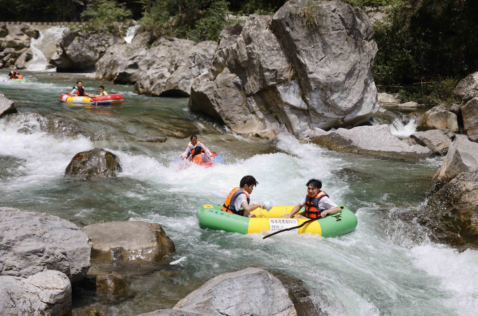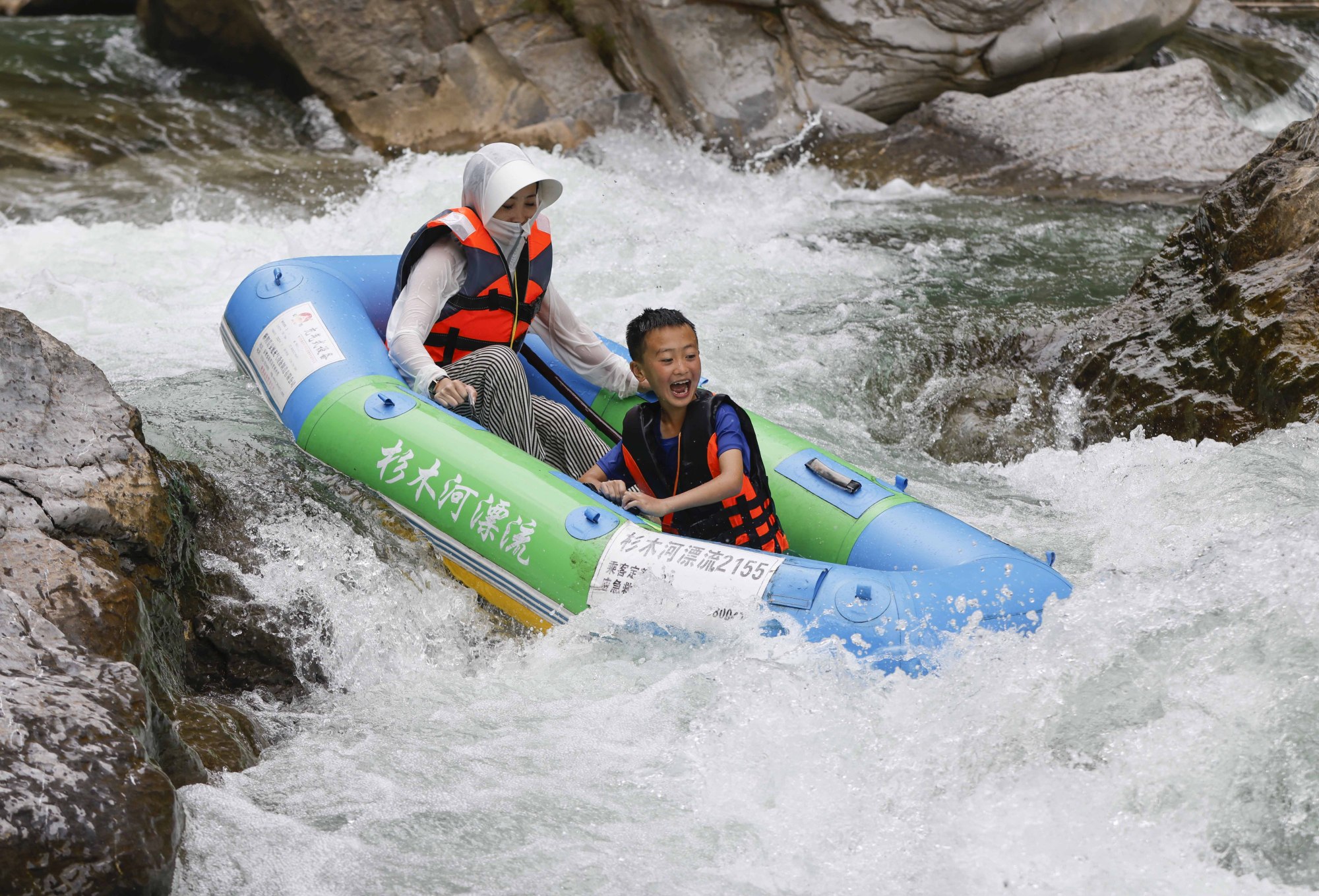 盛夏时节,贵州省黔东南苗族侗族自治州施秉县杉木河景区漂流迎来高峰期,游客纷至沓来,在青山绿水间放松心情,享受凉爽。(磨桂宾)