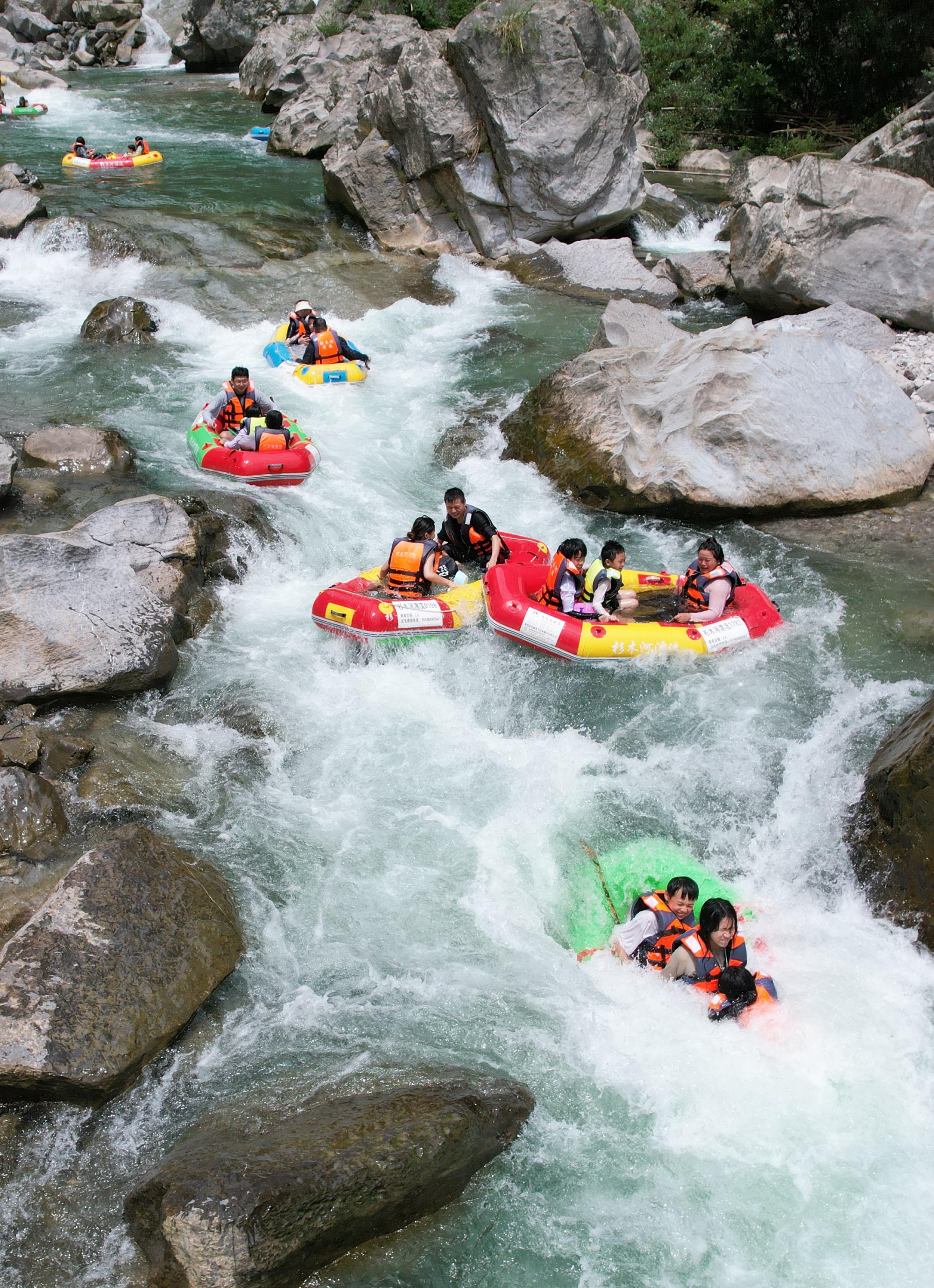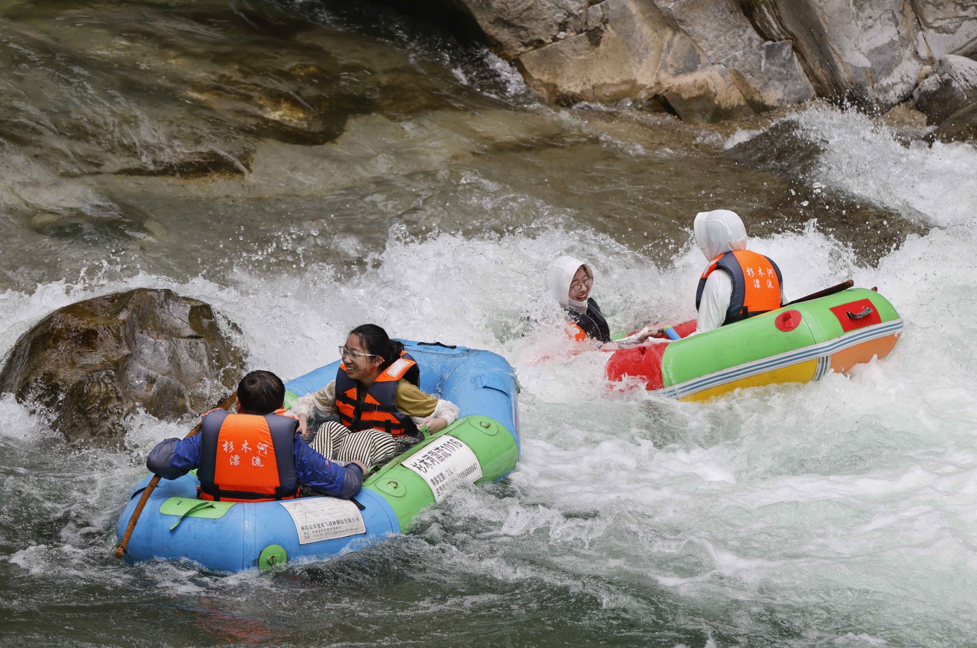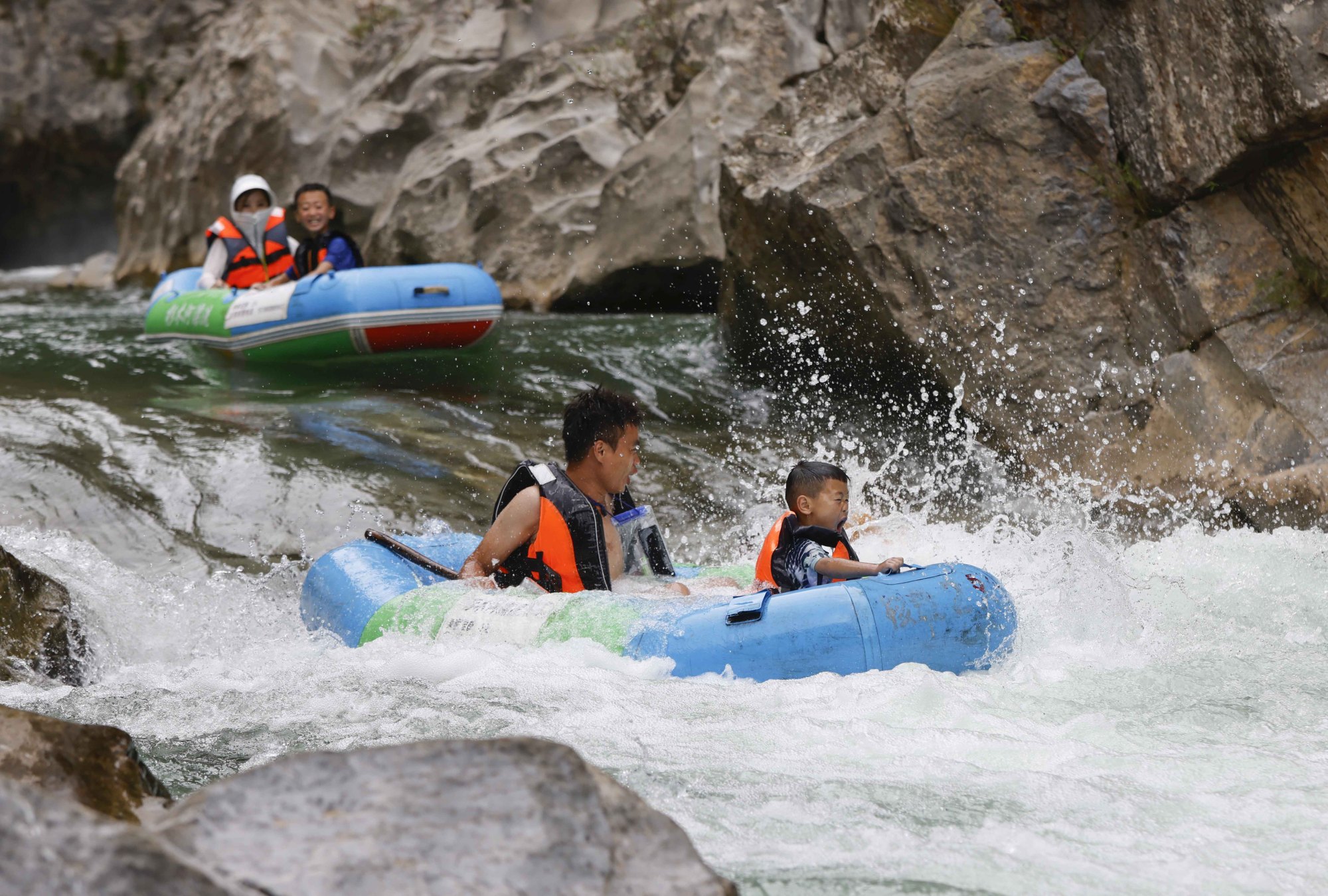 盛夏时节,贵州省黔东南苗族侗族自治州施秉县杉木河景区漂流迎来高峰期,游客纷至沓来,在青山绿水间放松心情,享受凉爽。(磨桂宾)
