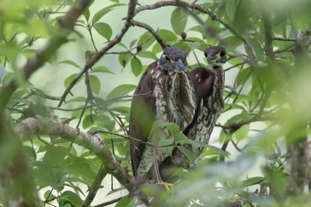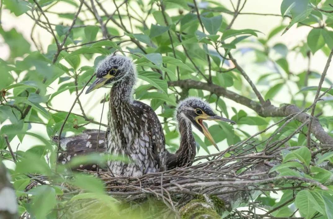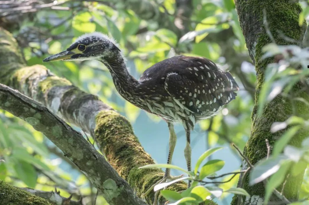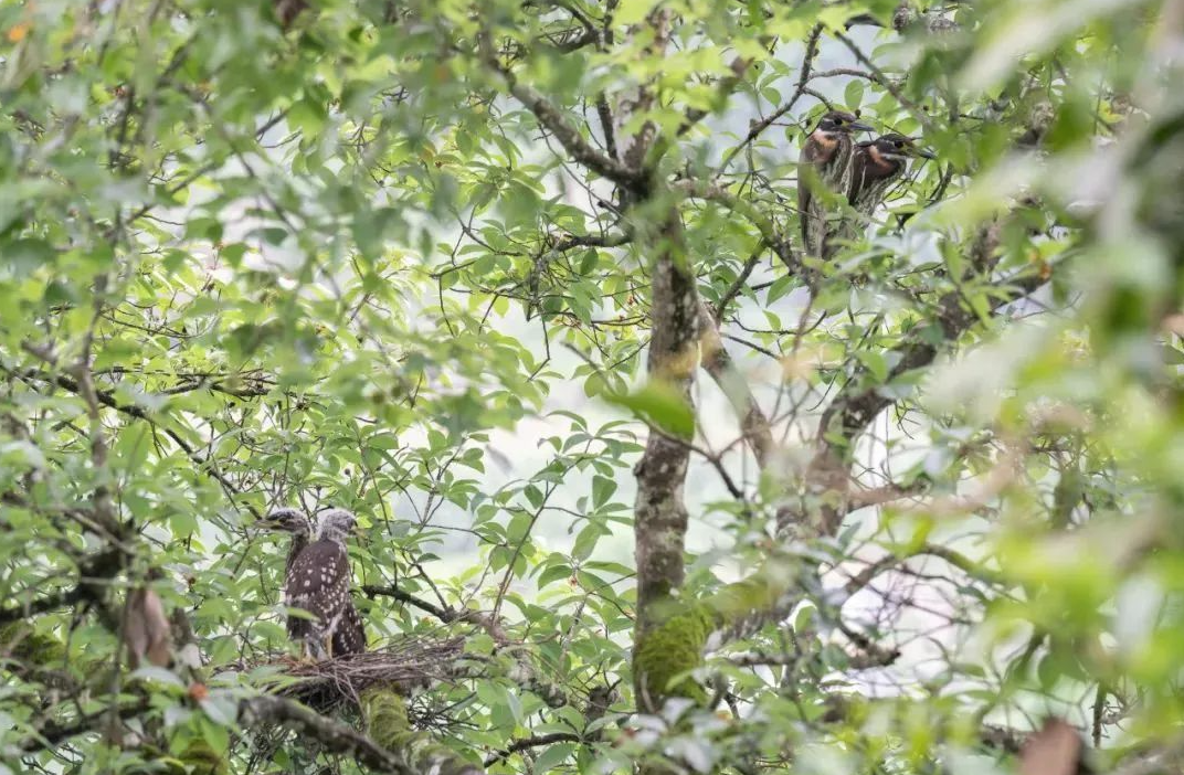 此次发现的海南鳽有成鸟2只,幼鸟2只,系一家,目前还处于育雏期。画面中的幼鸟羽翼还未丰满,成鸟则是在树上梳理毛发和警惕地观察四周情况。