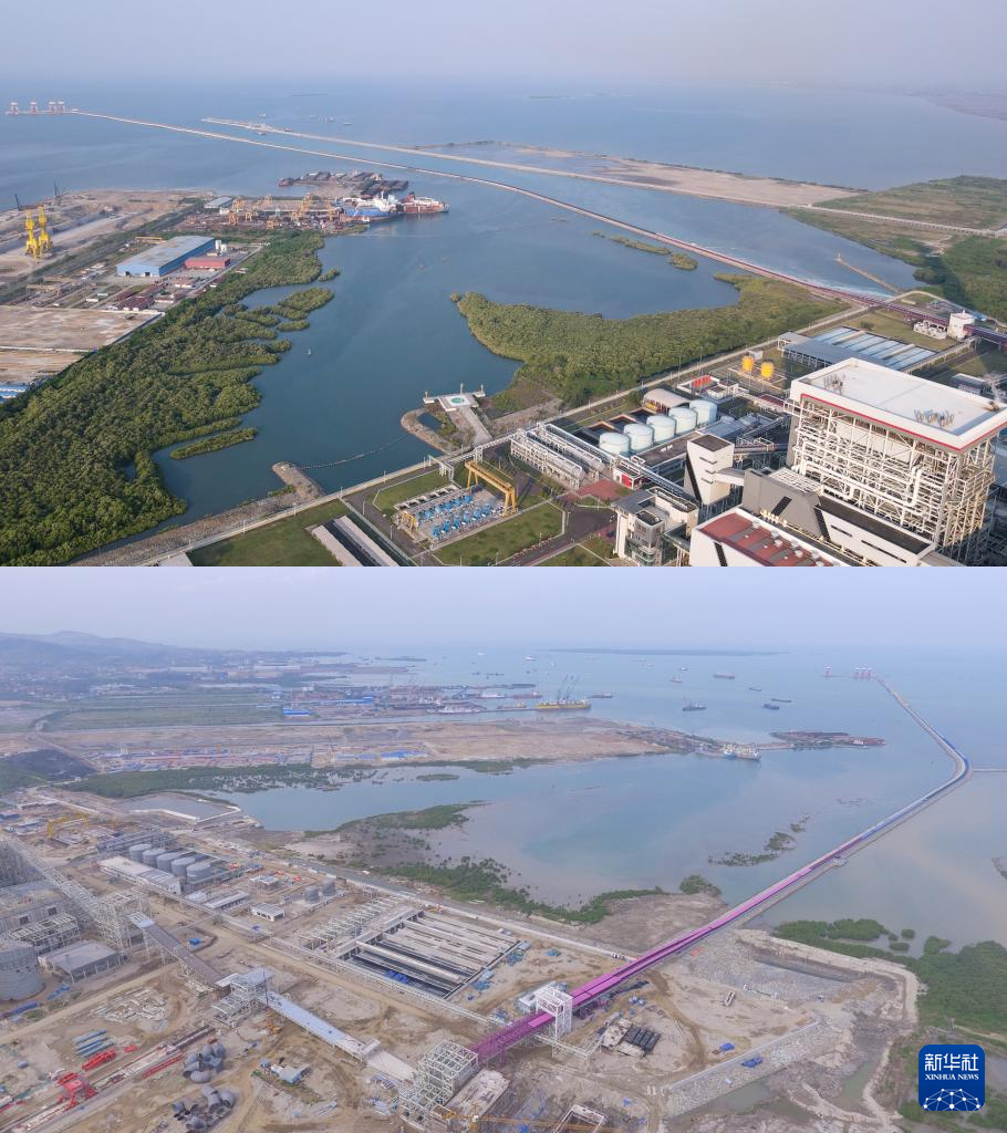 拼版照片:上图为2024年7月15日在印度尼西亚万丹省西冷爪哇7号项目附近海域拍摄的红树林(无人机照片,新华社记者徐钦摄);下图为2019年1月28日在印度尼西亚万丹省西冷爪哇7号项目附近海域拍摄的红树林(无人机照片,国能印尼爪哇发电公司供图)。