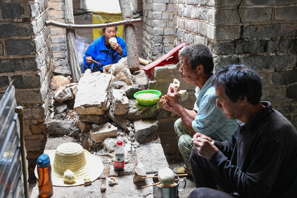 工人们在敌台内吃午饭(7月2日摄)。新华社记者 陈钟昊 摄