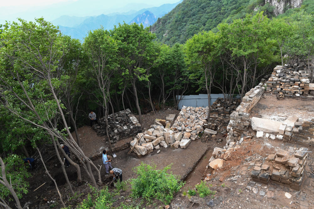 工人们在箭扣长城120号敌台考古现场进行考古发掘(7月2日摄)。新华社记者 陈钟昊 摄