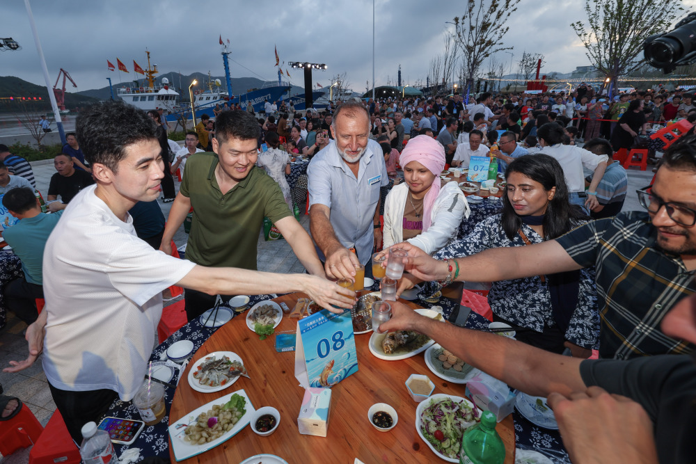 8月23日,游客在岱山县长涂镇举行的海岛特色黄鱼宴上举杯。新华社记者 徐昱 摄