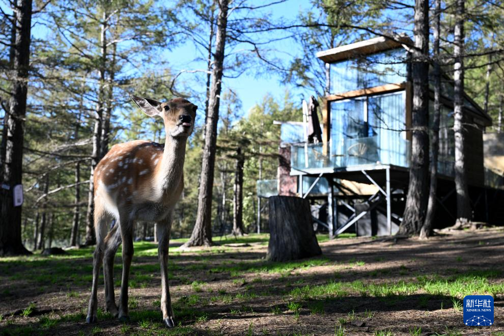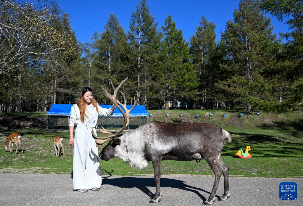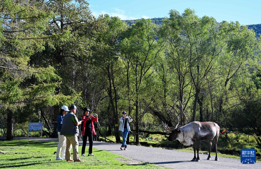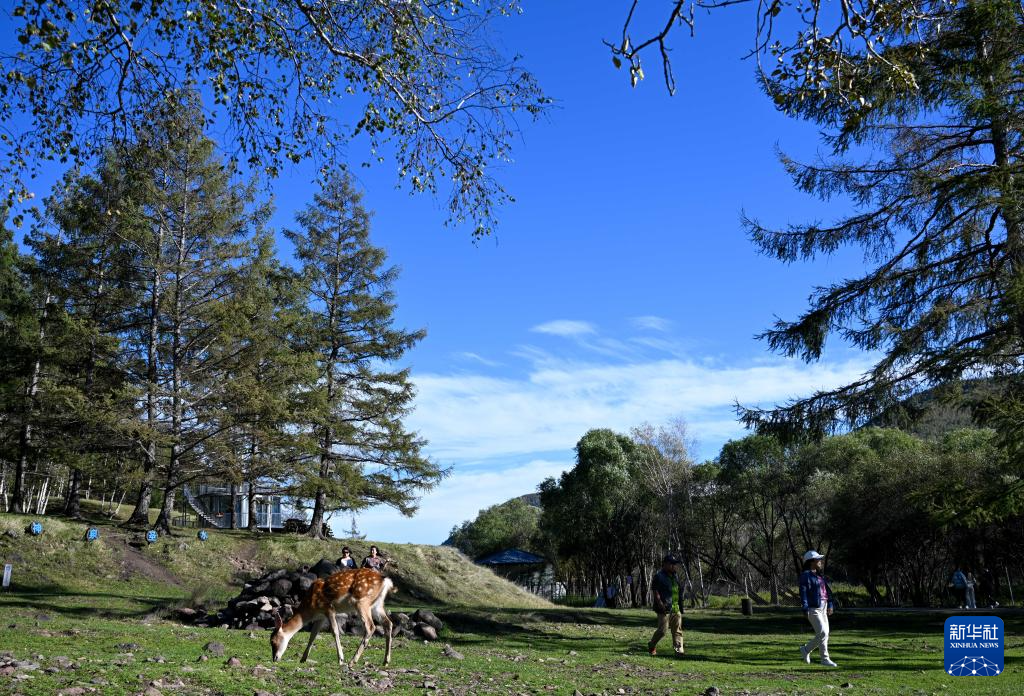 9月6日,游客在内蒙古兴安盟阿尔山市白狼镇白狼鹿园游玩。