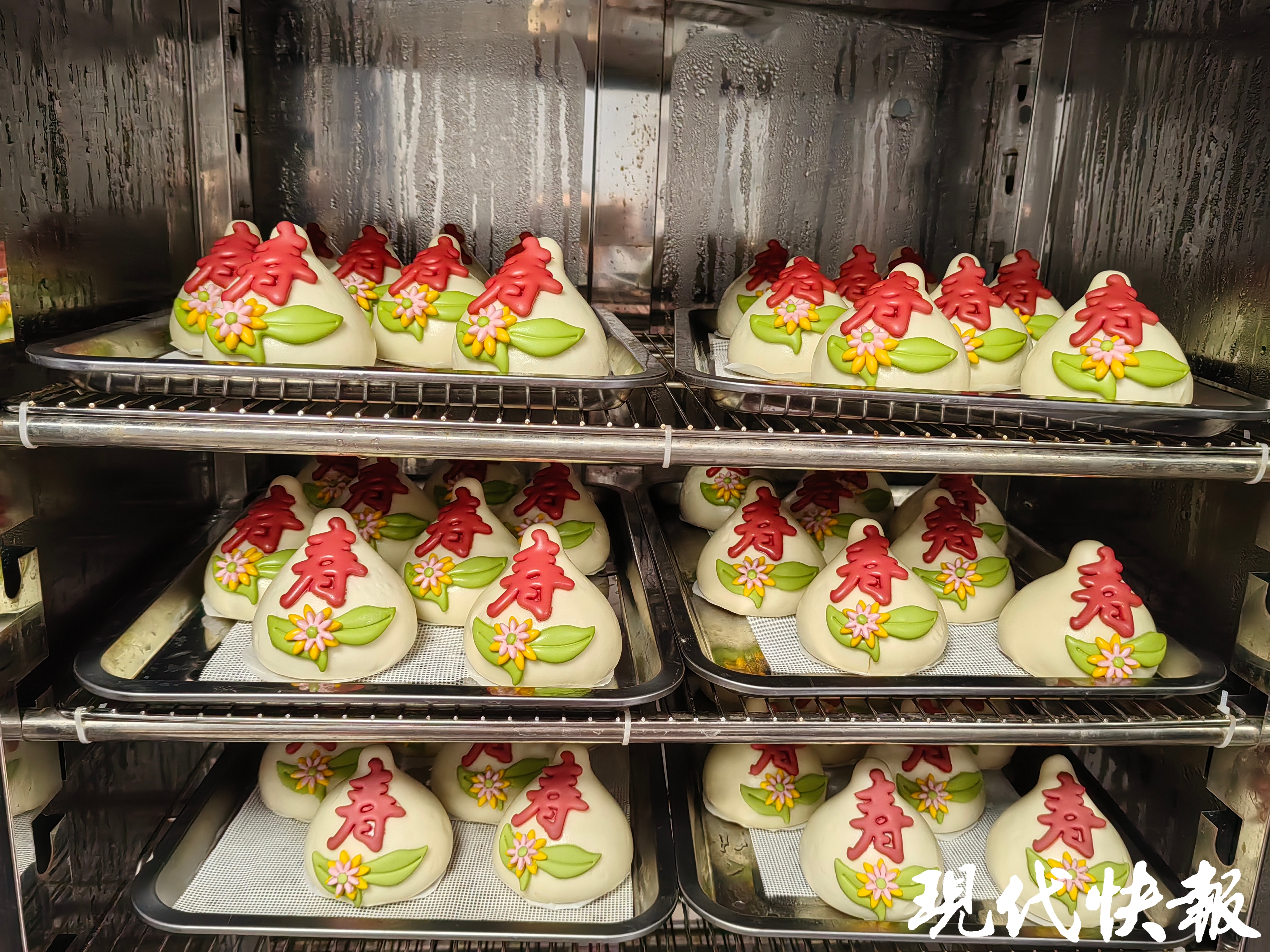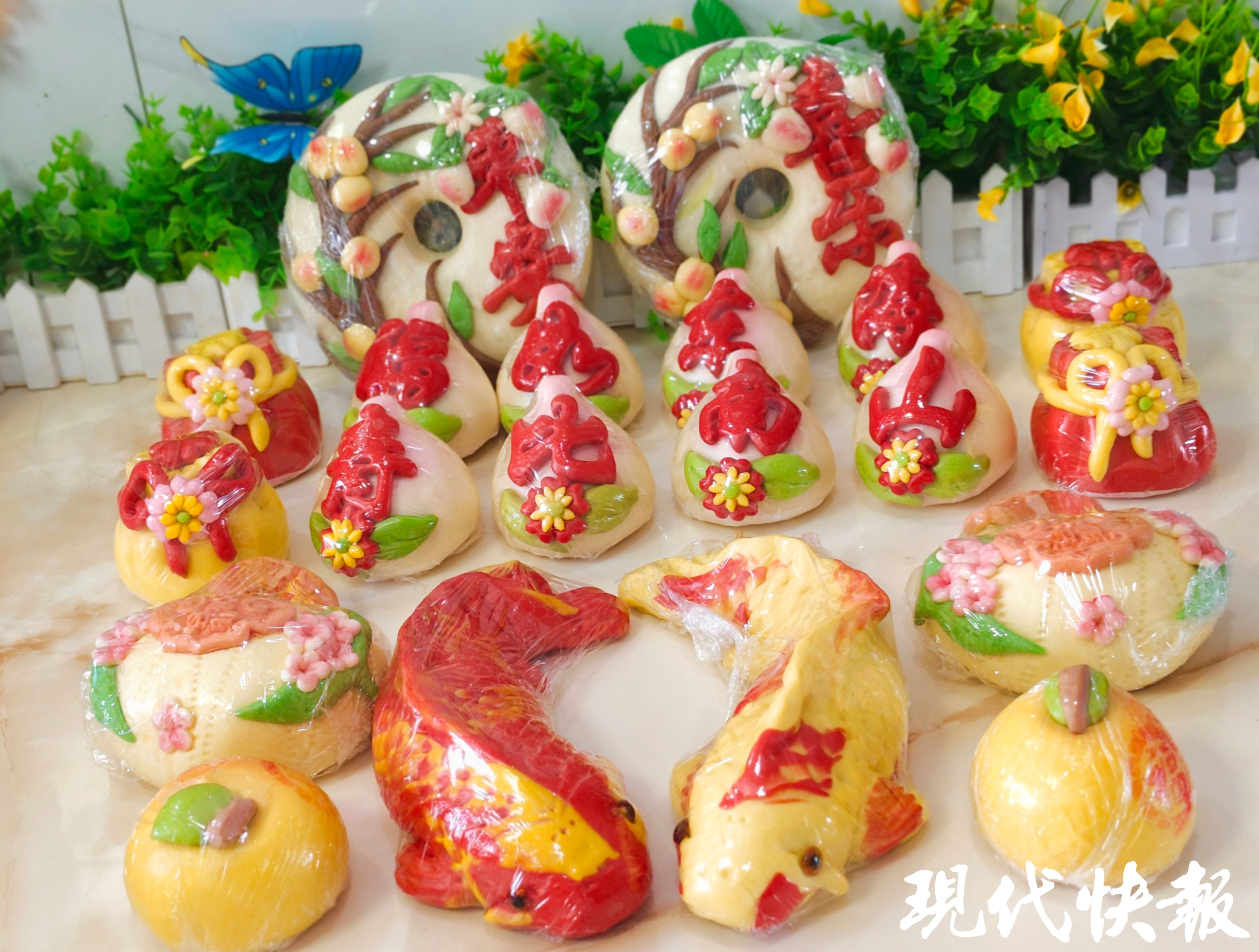 9月10日,现代快报记者来到孙玮家中,客厅和厨房放满了制作花馍的各类机器、原材料,一角的长桌上放着已经制作好的花馍,包括锦鲤、福袋、寿桃等,颜色鲜艳,造型精美。