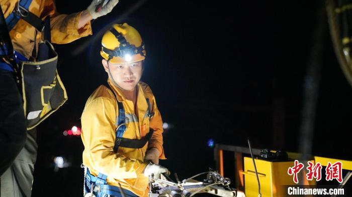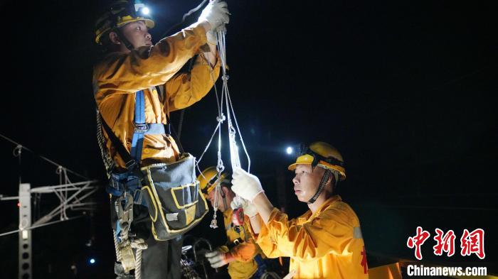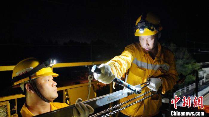 图为工作人员在测量接触网的参数。蔡星宏 摄