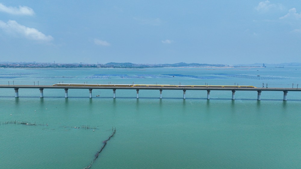 2023年6月28日,在湄洲湾跨海大桥,试验列车交会运行。国铁集团在福厦高铁福清至泉州区段组织开展了新型动车组新技术部件在更高运行速度条件下的性能验证试验,试验列车单列最高运行时速达到453公里,标志着CR450新一代动车组研制取得新进展。新华社发(铁科院集团公司供图)