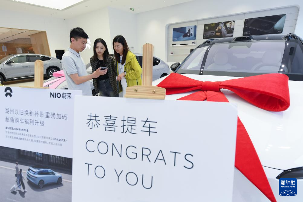 9月24日,在位于湖州市湖东街道的蔚来交付中心,销售人员向顾客介绍提车后如何申领以旧换新补贴。