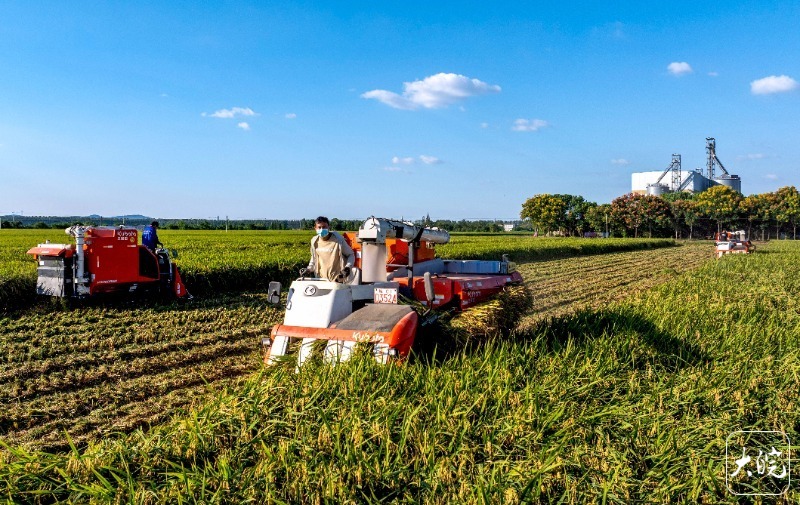 大皖新闻讯 近日, 合肥市庐江县白湖镇省级现代农业示范园,农机手正抓紧收割成熟的水稻。