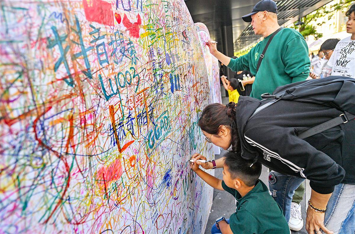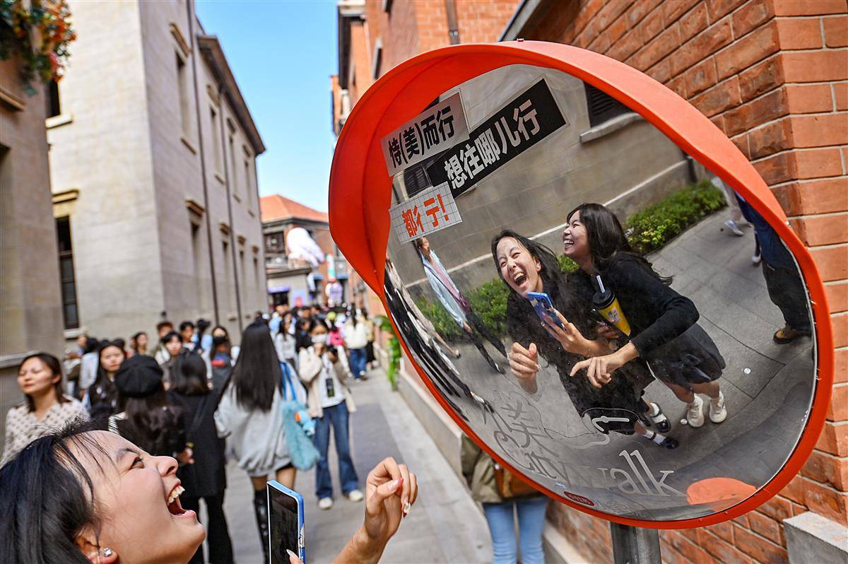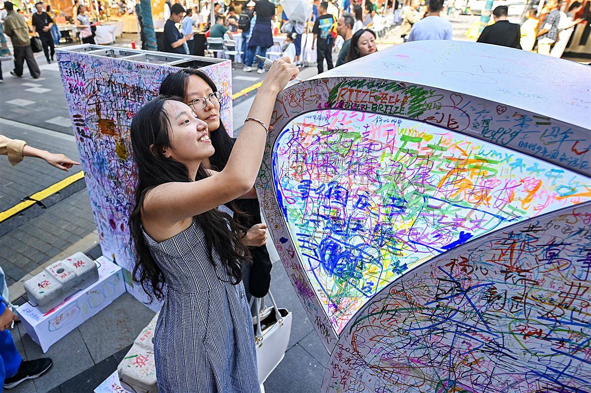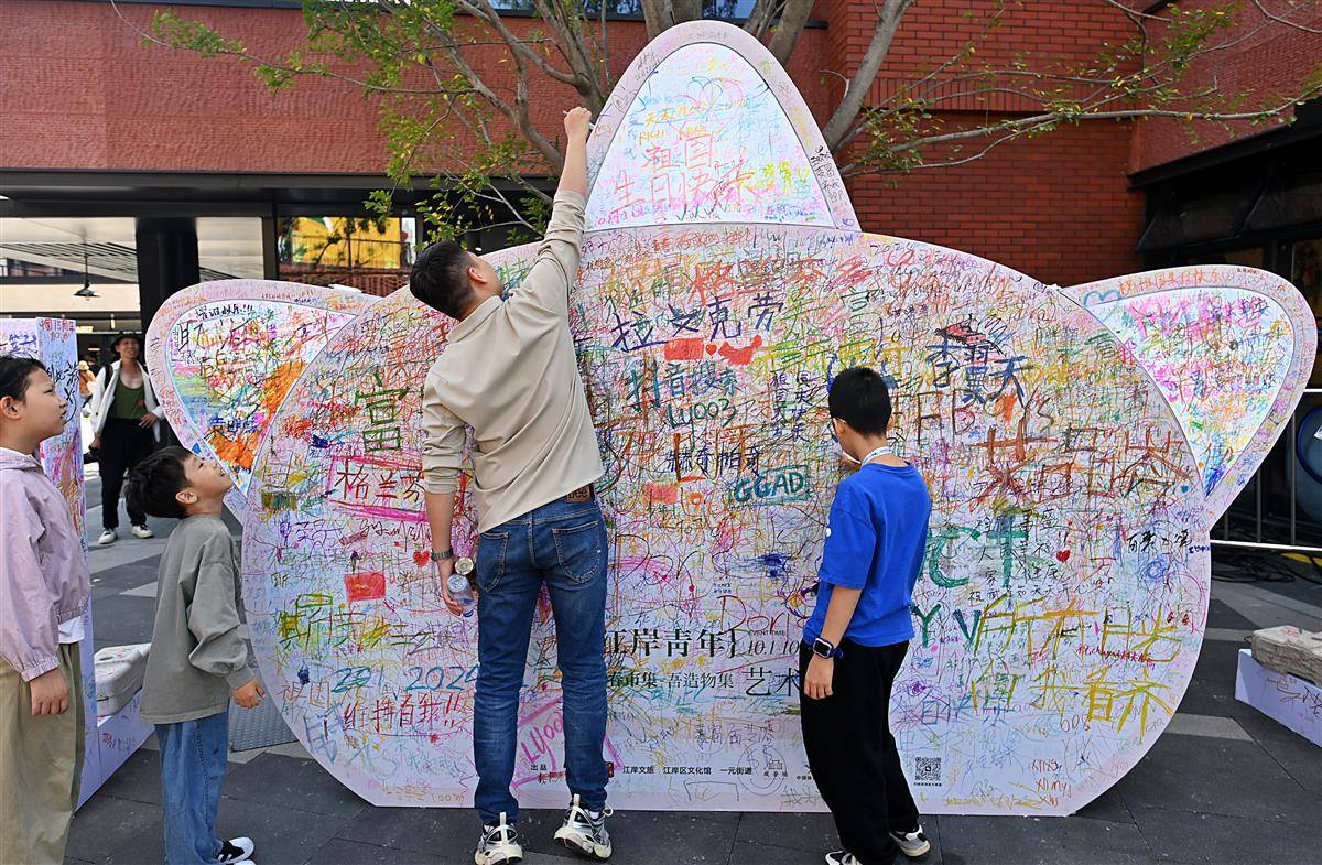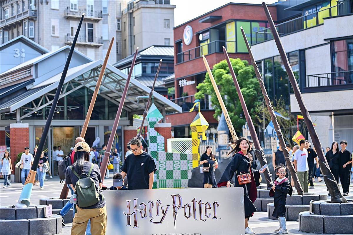 游客们惊喜地发现,数个“哈利波特”电影经典场景被复刻在这个百年老里份的街角巷口,信使猫头鹰海德薇停在三角房子上,分院帽悬浮在空中,穿墙火车停在广场上,8根巨大的魔杖指向天空。吸引了许多大朋友与小孩子合影。(湖北日报全媒记者朱熙勇摄)