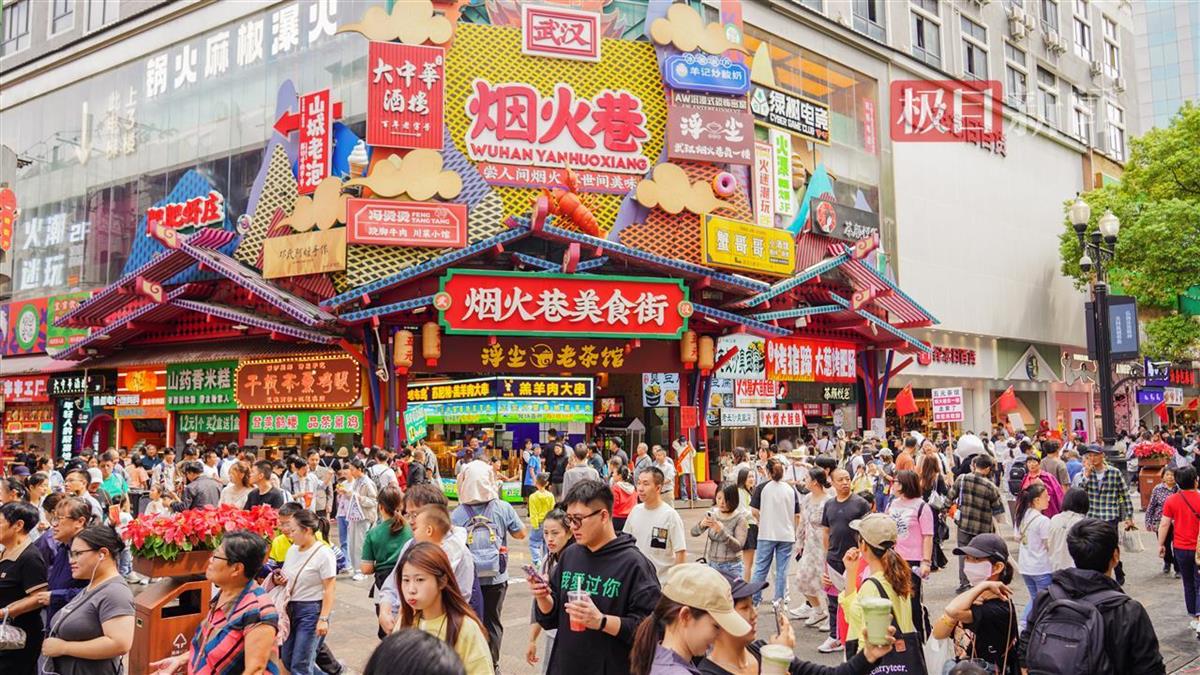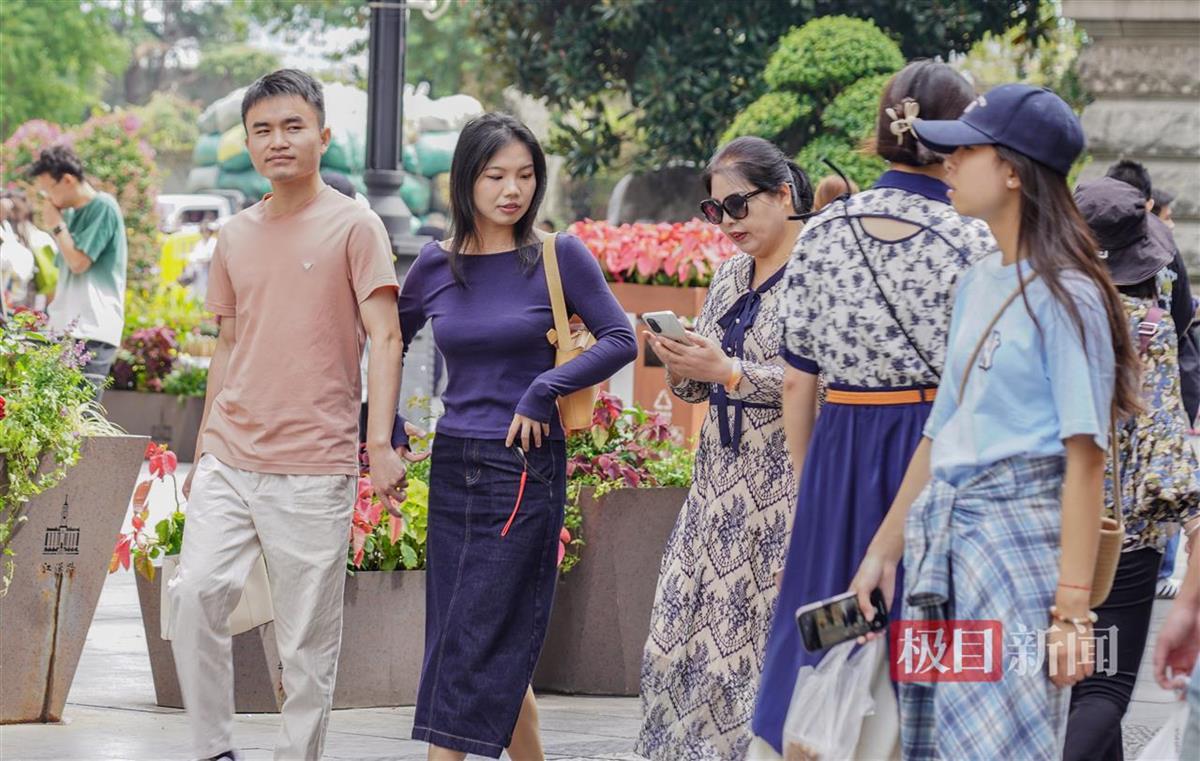 在江汉路1600多米长的步行街上,来自全国各地的游客在此逛街、购物、品尝美食,享受在百年商业老街里的假日惬意时光。据悉,国庆假期首日就有41.3万人次、最高峰时每小时达到3.6万人次逛繁华的江汉路步行街。