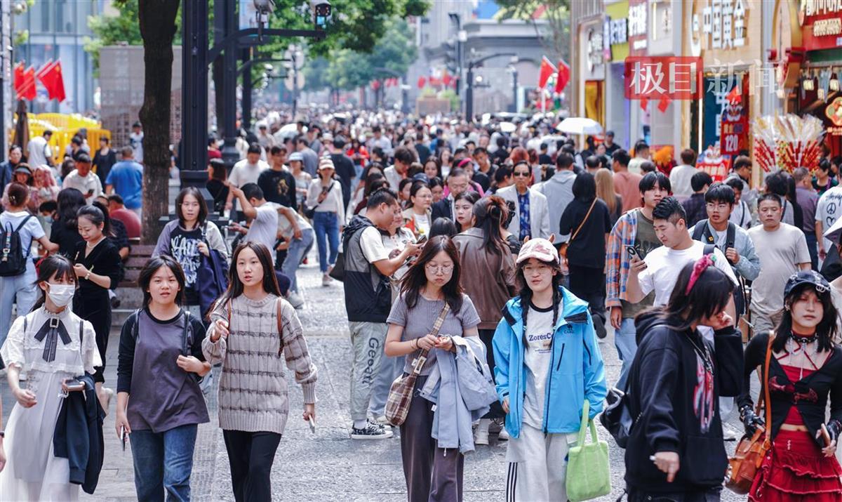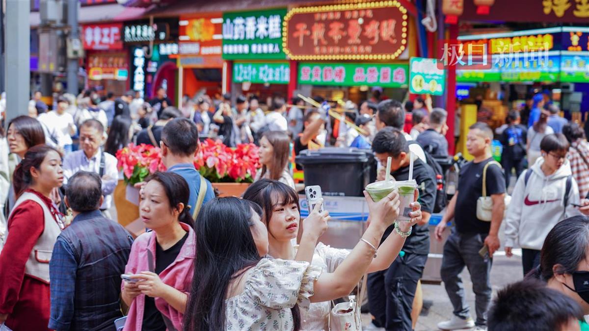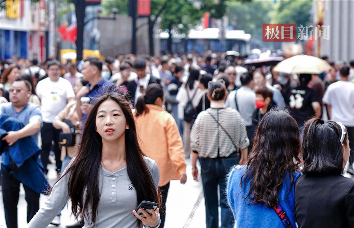 10月6日,武汉江汉路步行街游客如织,沿街店铺生意火爆,热闹非凡。