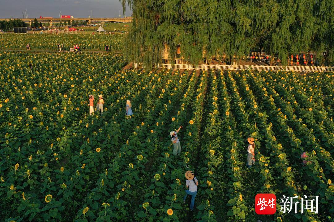 这片向日葵花海位于南京浦口区永宁街道张圩乡村,名为“葵花朵朵园”,面积有千亩。花海旁边是流经的滁河,远处是老山森林公园,河堤下方的这片“葵花朵朵园”,在蓝天白云的映衬下,呈现一大片金黄色。