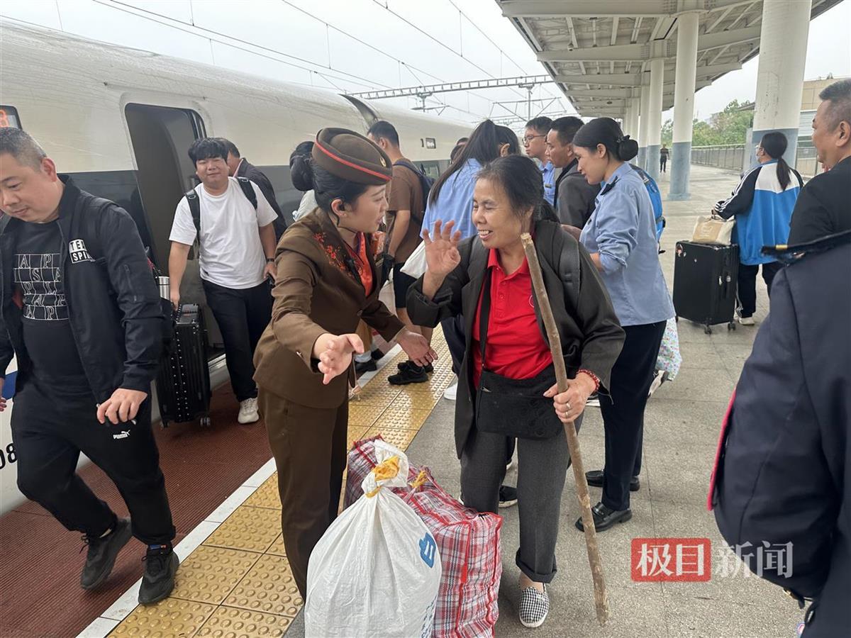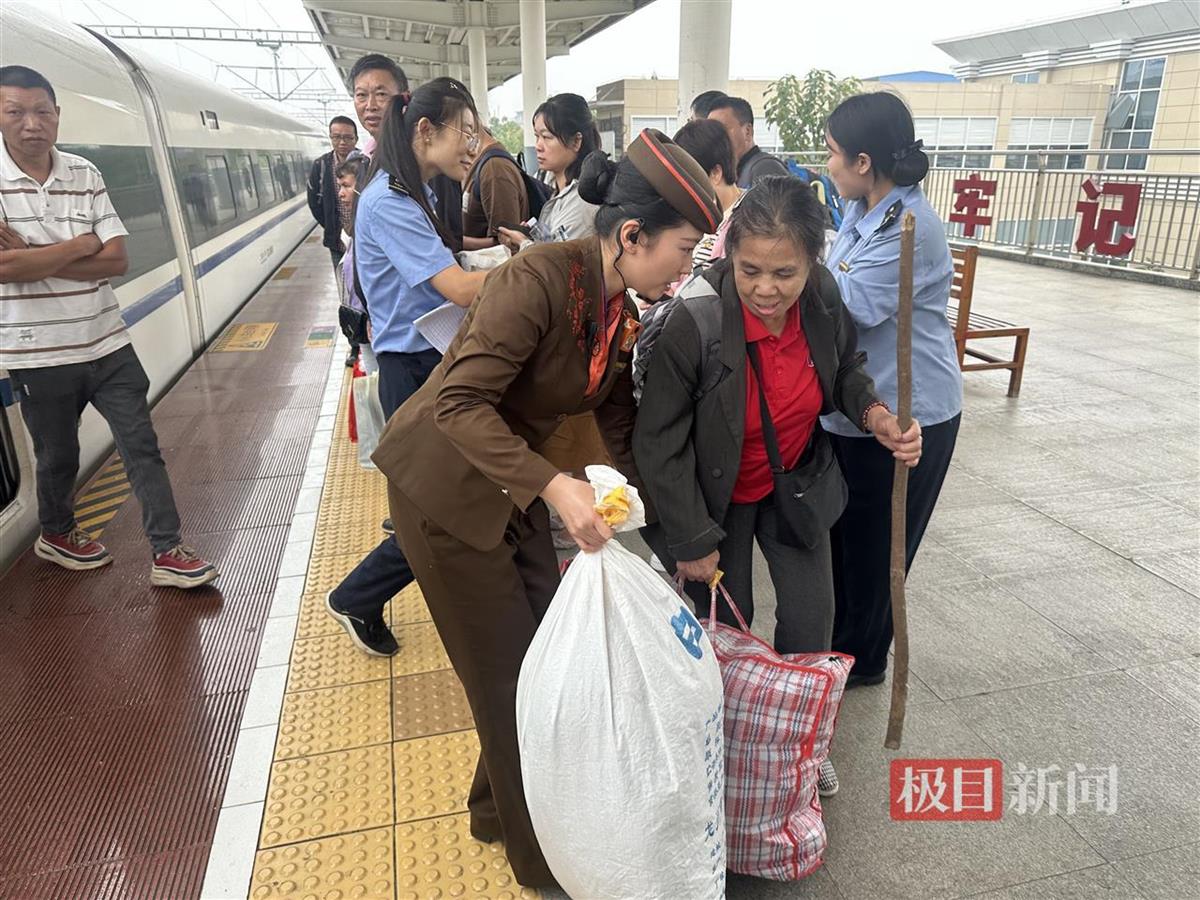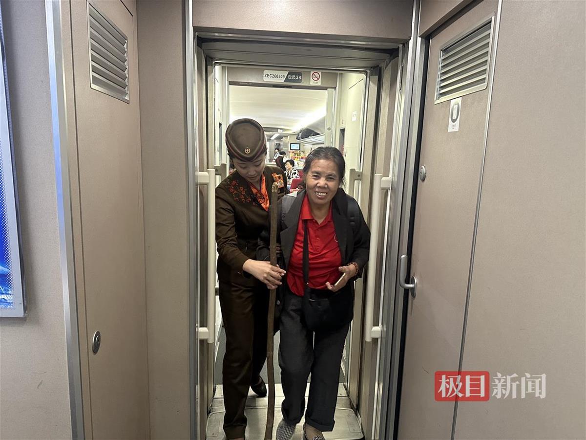 乘务员黄赛见状,立即上前询问并主动帮助老人将行李安置好。她了解到王奶奶今年68岁了,独自到全州看望女儿。旅途中,黄赛不仅时刻关注老人的需求,还为她送上了热水。下车时,黄赛更是细心地将老人的行李和特产一一拿着,安全地护送她到车门口,并告知她如何快速出站。