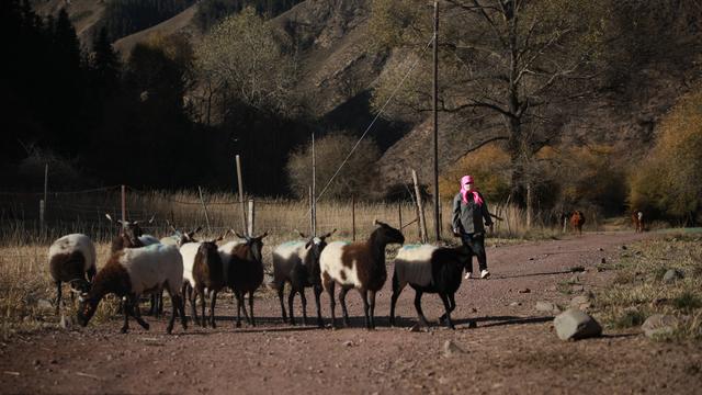 10月15日,肃南裕固族自治县康乐镇隆丰村的牧民在驱赶羊群。新华社记者 张睿 摄