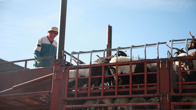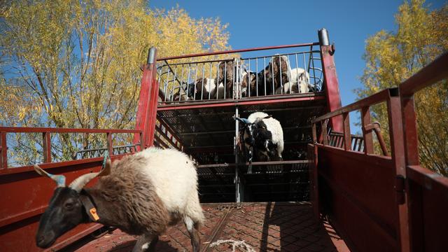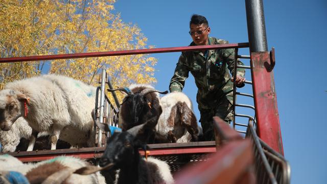 10月15日,在肃南裕固族自治县,卡车司机贾正兴将羊群装车,准备运往临泽县的异地借牧点。新华社记者 张睿 摄