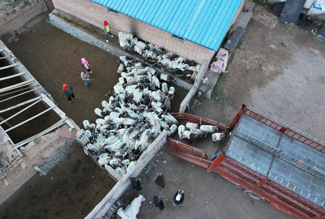 10月15日,肃南裕固族自治县康乐镇隆丰村的牧民将羊群赶往运输车上,准备运往临泽县的异地借牧点(无人机照片)。新华社记者 张睿 摄