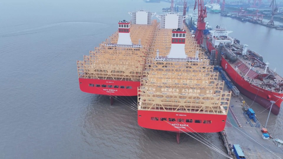 15日,中国船舶集团旗下江南造船为太平船务建造的14000TEU LNG双燃料集装箱船系列船首制船(H2785船)及第二艘船(H2786船)举行双船命名仪式,被分别命名为“KOTA EAGLE(鹰城)”、“KOTA EMERALD(翠城)”,其中“KOTA EAGLE(鹰城)”于当日签字交付。