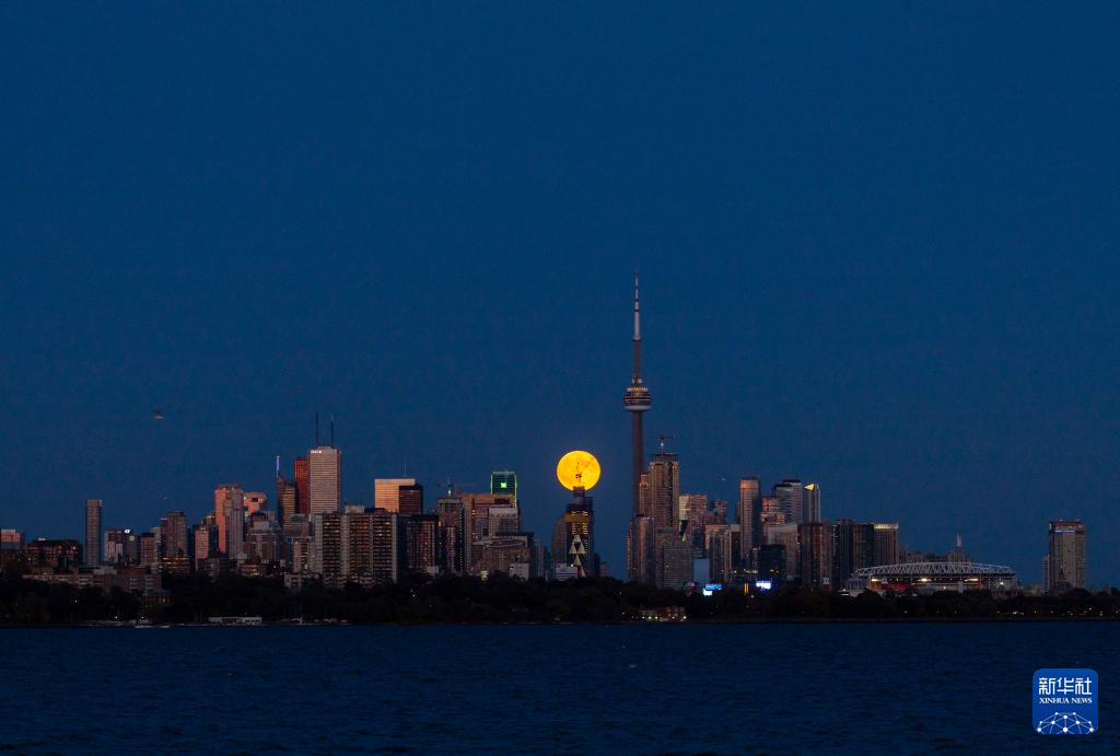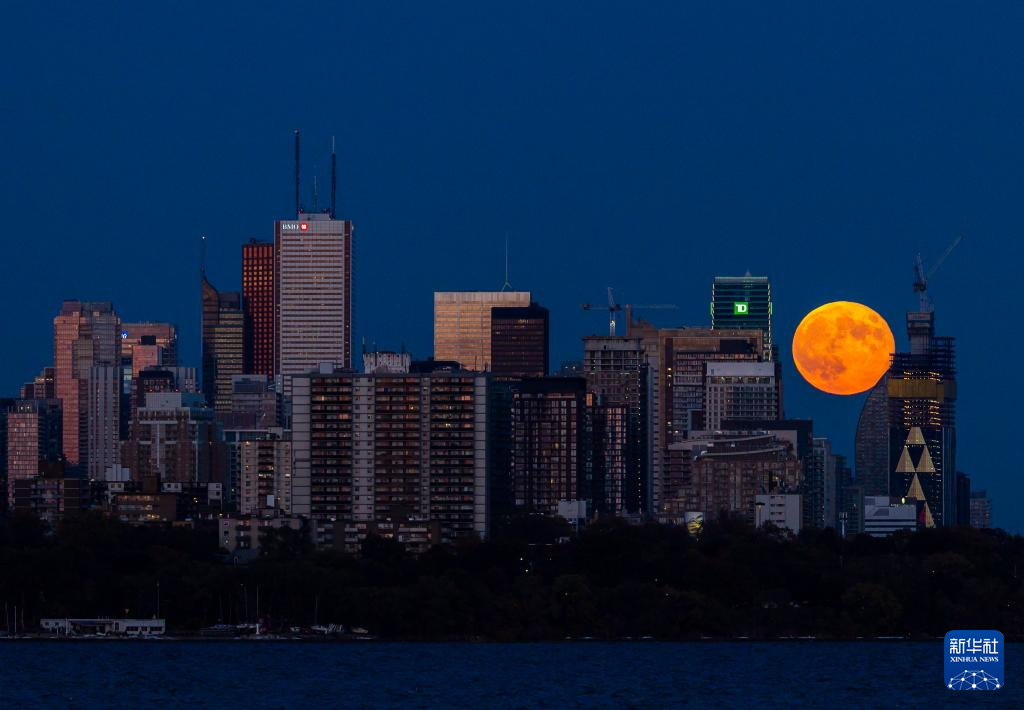10月17日,人们在加拿大多伦多拍摄一轮满月从城市天际线上升起。