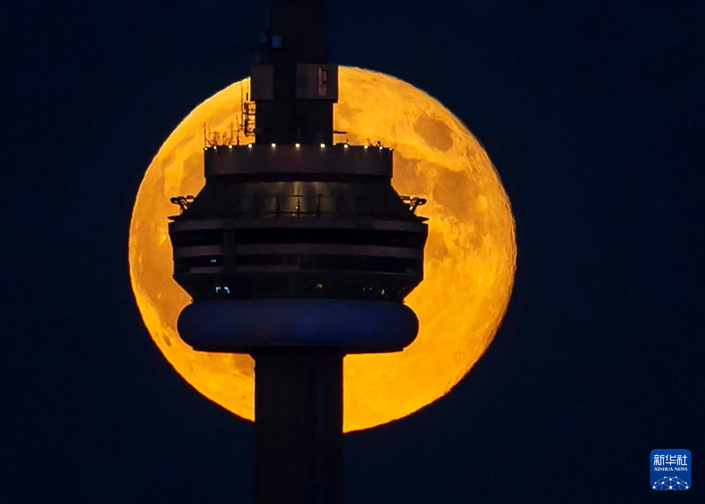 这是10月17日在加拿大多伦多拍摄的一轮满月与加拿大国家电视塔。