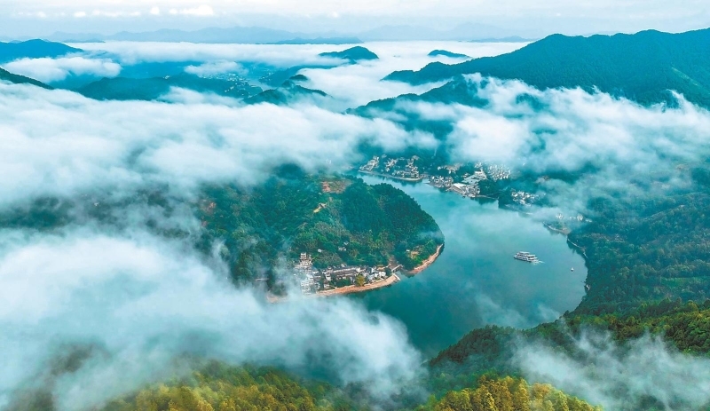 10月22日,黄山市歙县新安江武阳湾水域,碧水环流,云雾缥缈。