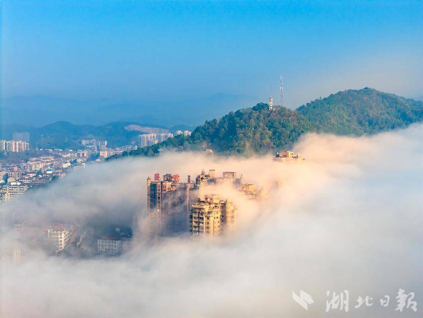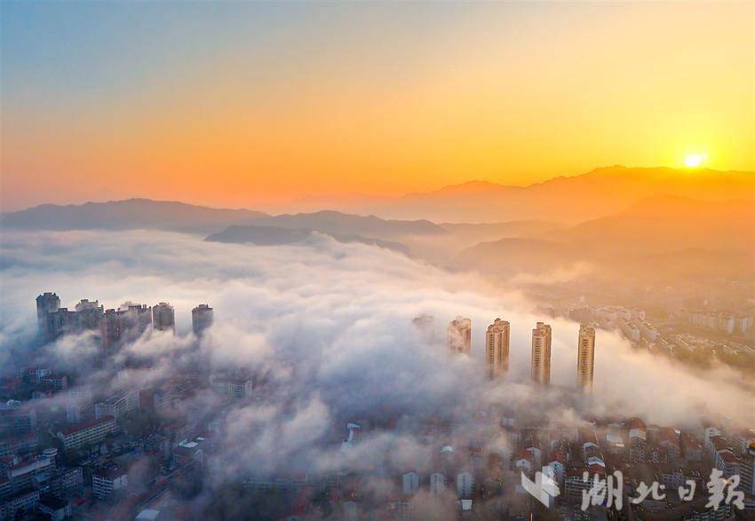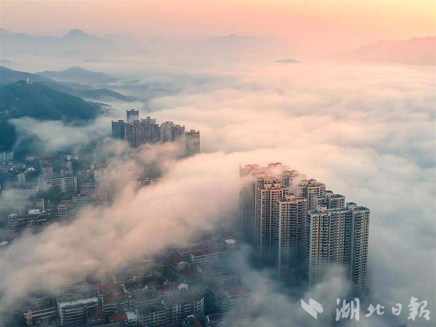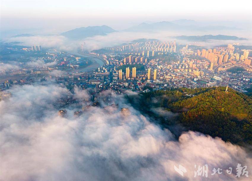 10月23日,黄冈市英山县温泉镇现平流雾景观,城市建筑在雾海之中若隐若现,与青山、云雾、河流交相辉映,美若画卷。(湖北日报通讯员王江)