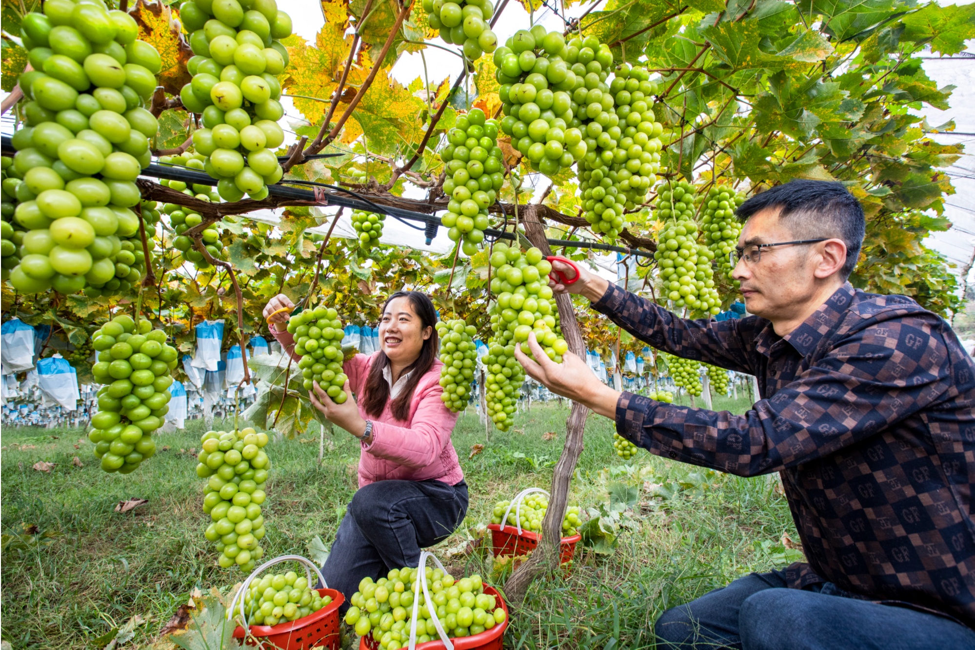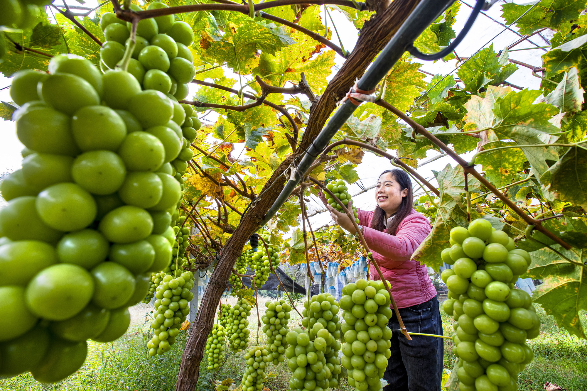 村民在果园里采摘阳光玫瑰葡萄(史开心摄)
